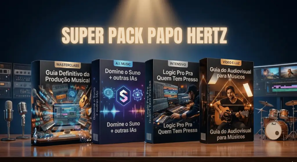 O Super Pack Papo Hertz reúne quatro treinamentos completos que ensinam desde a criação da música até a produção de conteúdo audiovisual para divulgação.